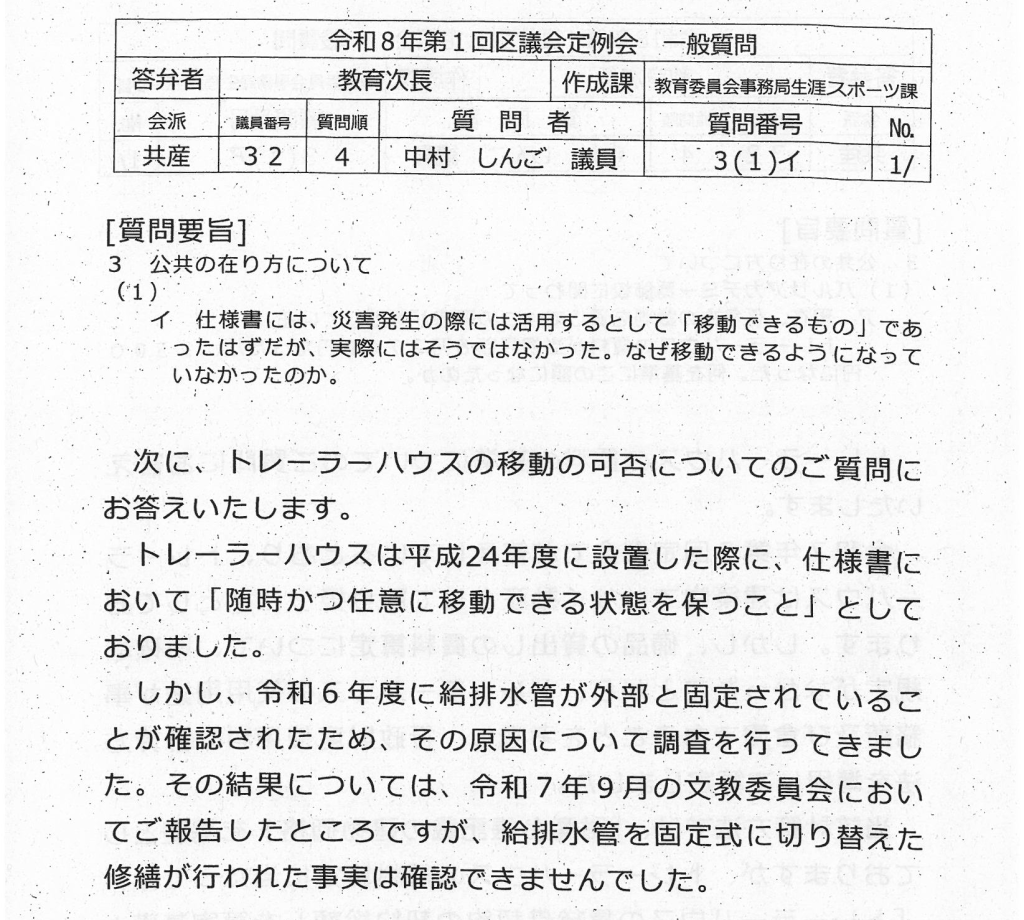 トレーラーハウスの移動の可否について(一般質問より) 2026 2/27 出産・子育て・教育 2026.02.27 仕様書には、災害発生の際には活用するとして「移動できるもの」であったはずだが、実際にはそうではなかった。なぜ移動できるようになっていなかったのか。 出産・子育て・教育 よかったらシェアしてね!