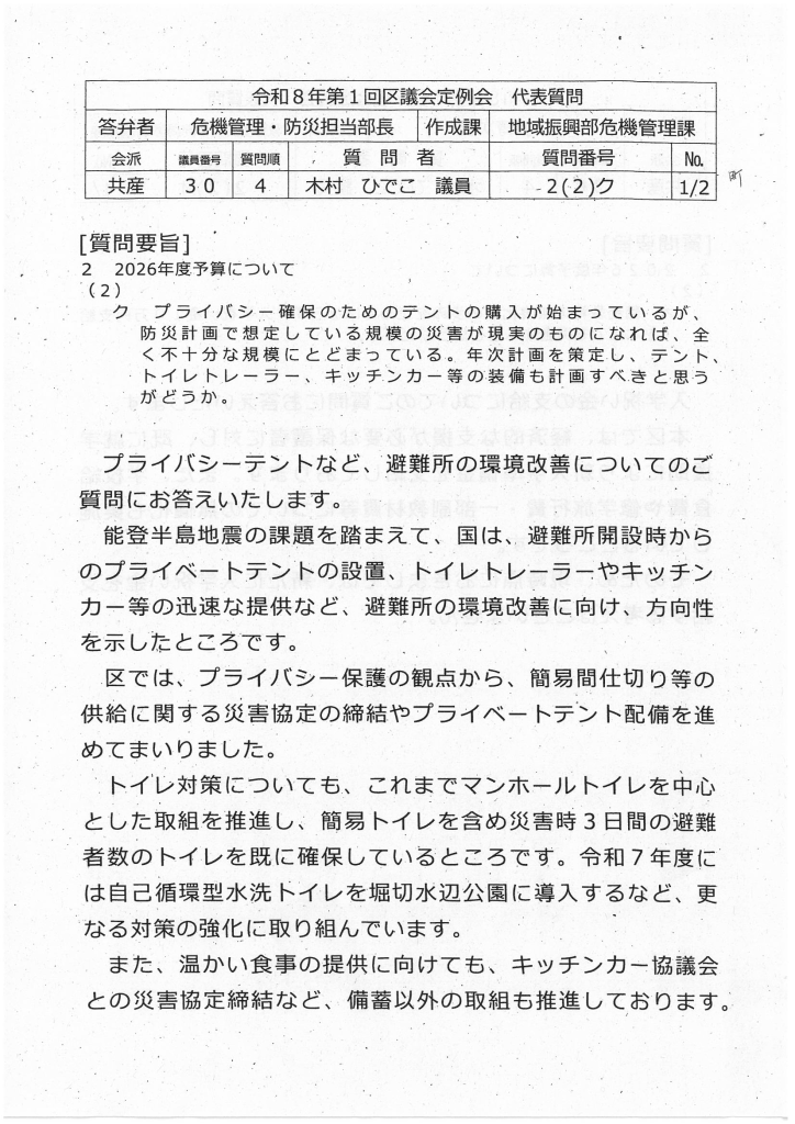 プライバシーテント等避難所の環境改善について(代表質問より)
