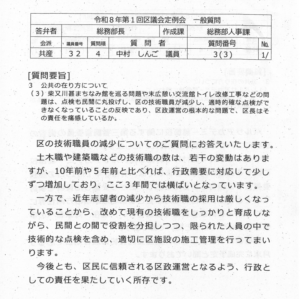 「柴又川甚まちなみ館」は設計に書かれていた「梁がなかった」というおよそありえないことが明らかとなり、開館延期となったのです。この間の末広憩い交流館トイレ改修工事では、アスベスト対策がされていない中での工事だったことが後から発覚しました。こうした一連の問題は、点検も民間に丸投げをし、点検にあたる区の技術職員が減少し、適時的確な点検ができなくなっていることの反映です。こうした問題は区政運営の根本的な問題であり、区長はその責任を痛感しているのか。