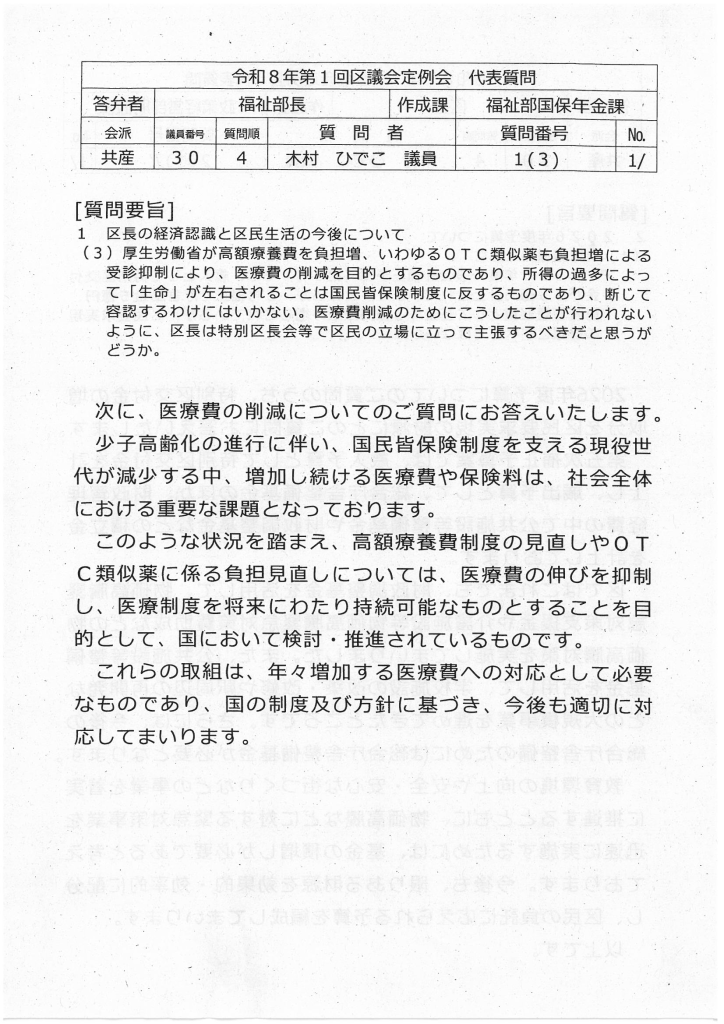 医療費削減のためにこうしたことが行われないように、区長は特別区長会等で区民の立場に立って主張するべきだと思いますが答弁を求めます。