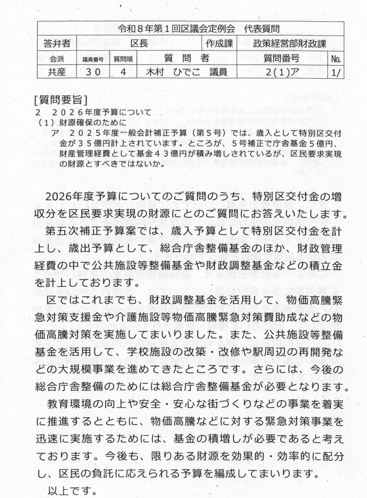 特別区交付金増収分を区民要求実現の財源に(代表質問より) 2026 2/26 暮らし・医療・介護 2026.02.26 活用されるべき財源として、2025年度5号補正予算では、歳入として特別区交付金が35億円計上されています。ところが、5号補正で庁舎基金5億円、財産管理経費として基金43億円が積み増しされています。これを財源として、区民要求に充てるべきではないか。 暮らし・医療・介護 よかったらシェアしてね!