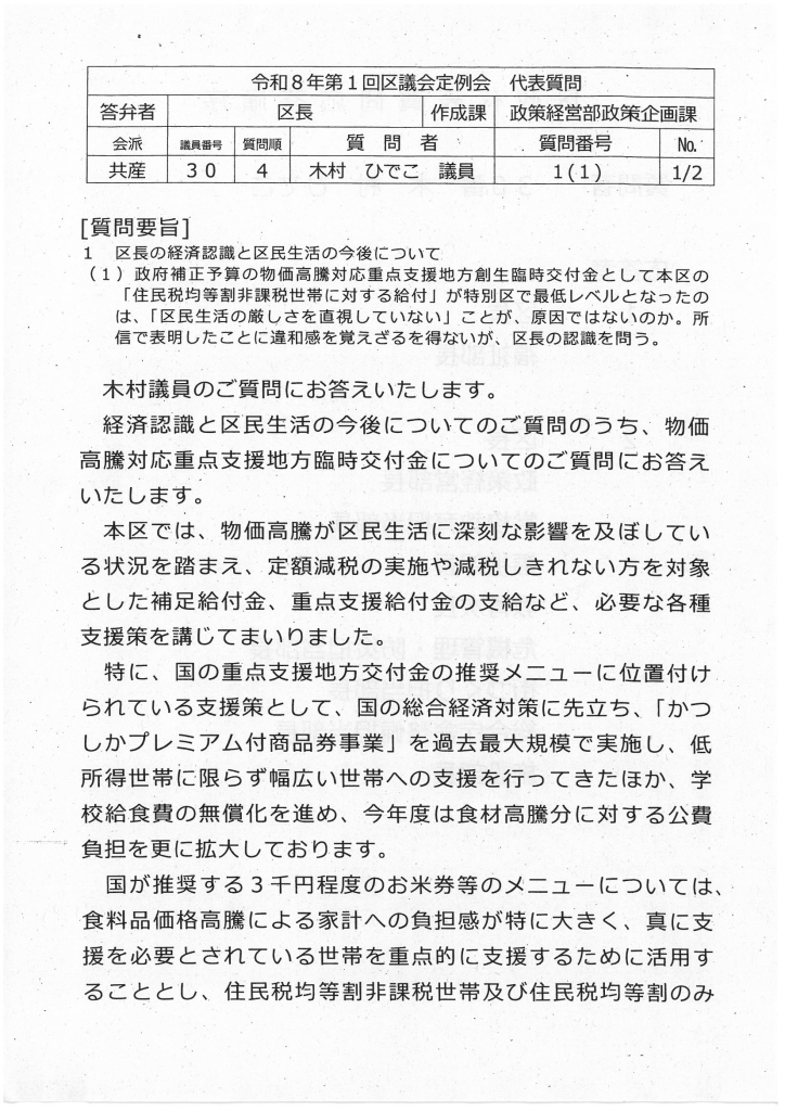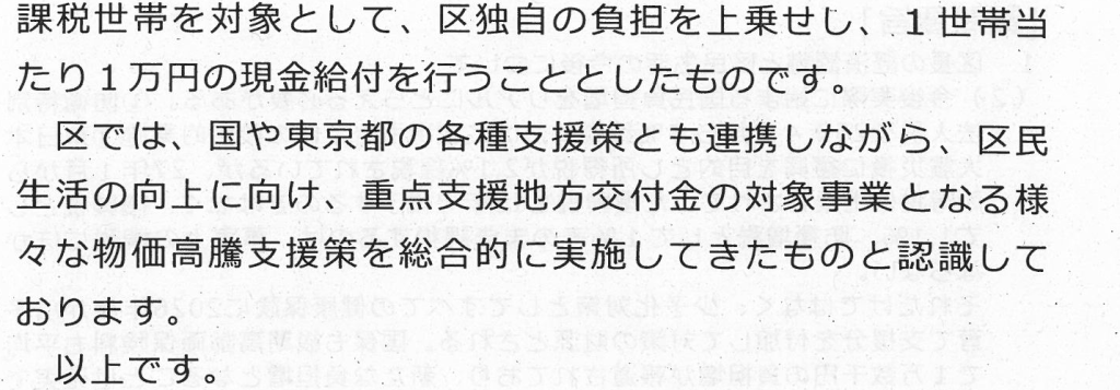 なぜ最低なのか、この重点交付金は、21億円余ですが、本来、この重点交付金に使うべきではない事業で、この交付金が決定する前に決定したプレミアム商品券や中小事業者への給付の財源にしたからに他なりません。しかも、対象にすべきではない事業予算に割り当てた結果、区民に対する給付を小さくするしかなくなってしまいました。そのうえ、はなから、区民のために一般財源を投入しないからに他なりません。