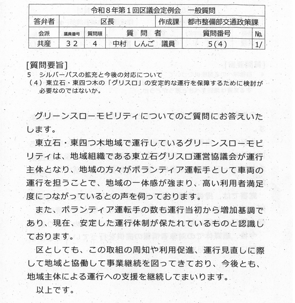 東立石・東四つ木の「グリスロ」の安定的な運行を保障するためには、現行の方式のままでよいのかという問題です。大分市では完全に行政が委託して運行しています。今後、地域の足として安定的な「グリスロ」として定着させるための検討が必要なのではないか。